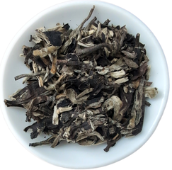 A Western version of the classic White Peony (白牡丹) tea from Yunnan, this tea is made from leaves that are air dried (withered) instead of cooked. The name stems from the silver leaves interspersed amongst the black leaves. The leaves of this tea are withered at night to increase the withering time, which in terms increases the tea’s floral aroma. Legend has it the shimmering silver leaves are leaves imbued with the moonlight they withered beneath. More likely, they reflect the fact the tea is made from a mixture of buds and leaves with one side of some leaves being covered in fine white hair.